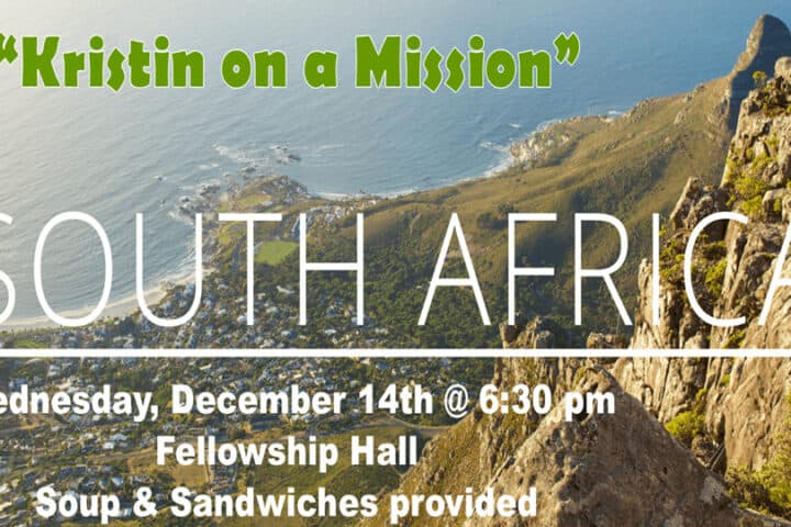 Join us for Kristin on a Mission 6:30 pm, December 14th in the Fellowship Hall. We will hear from Kristin, a South African Missionary, who will share with us about ABBA’s House. Soup & sandwiches provided! Please Register to let us know how many to prepare for.