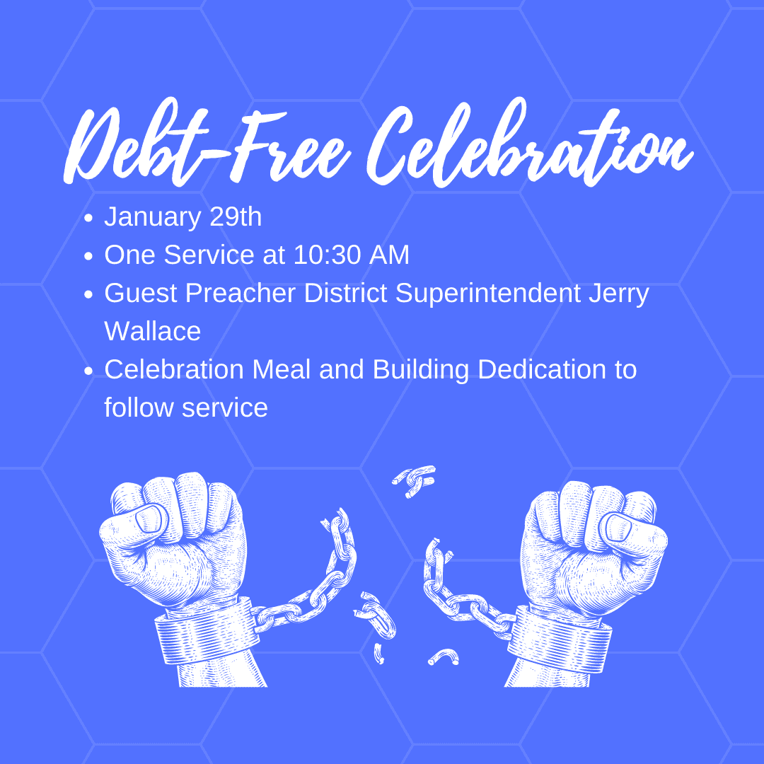 Come celebrate with us Sunday January 29th for a special worship service at 10:30 am. Our chains are gone as we celebrate God’s gift of being DEBT FREE!!! Special guest, District Superintendent Rev. Jerry Wallace will be bringing the message. We will gather after service for lunch and building dedication.