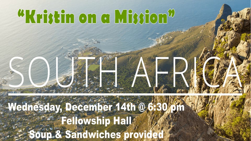 Join us for Kristin on a Mission 6:30 pm, December 14th in the Fellowship Hall. We will hear from Kristin, a South African Missionary, who will share with us about ABBA’s House. Soup & sandwiches provided!