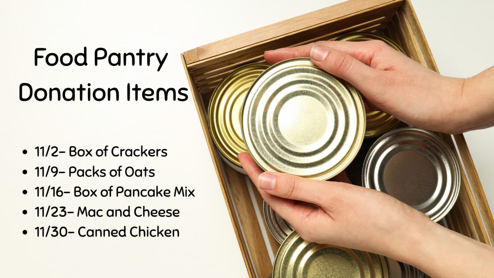 Our food pantry is collecting donations this month to support members of our community in need. Please consider helping by bringing items from the list in the attached picture. Donations can be dropped off at the church. Thank you for your generosity in supporting those who need it most.